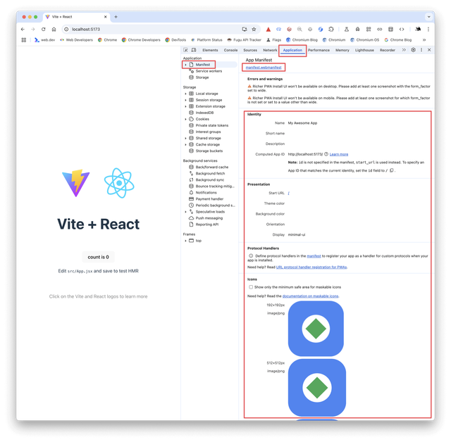 Open your browser's DevTools, you should see how the browser has parsed the Web App Manifest for this page.